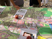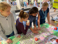 Um die Besucher*innen auf die Idee der Raumpatenschaften aufmerksam zu machen, sollte die Umsetzung visualisiert werden. Dazu wurde ein Plan von Pratteln auf A0 Format Plakate vergrössert und präsentiert. Mit einem Marker wurden die Räume markiert, für die Jemand die Patenschaft bereits übernommen hat oder übernehmen will.