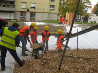 Erfreulicherweise war die Verwaltung der Liegenschaft bereit, auf die Ideen der Kinder einzugehen. Durch die Wiederverwendung der bestehenden Spielgeräte konnte das Budget für einen Sandkasten, ein Basketballkorb, ein Fussballgoal und eine Hängemattenschaukel eingesetzt werden. Die Kinder und Eltern halfen bei den Bautagen nach den Herbstferien tatkräftig mit.